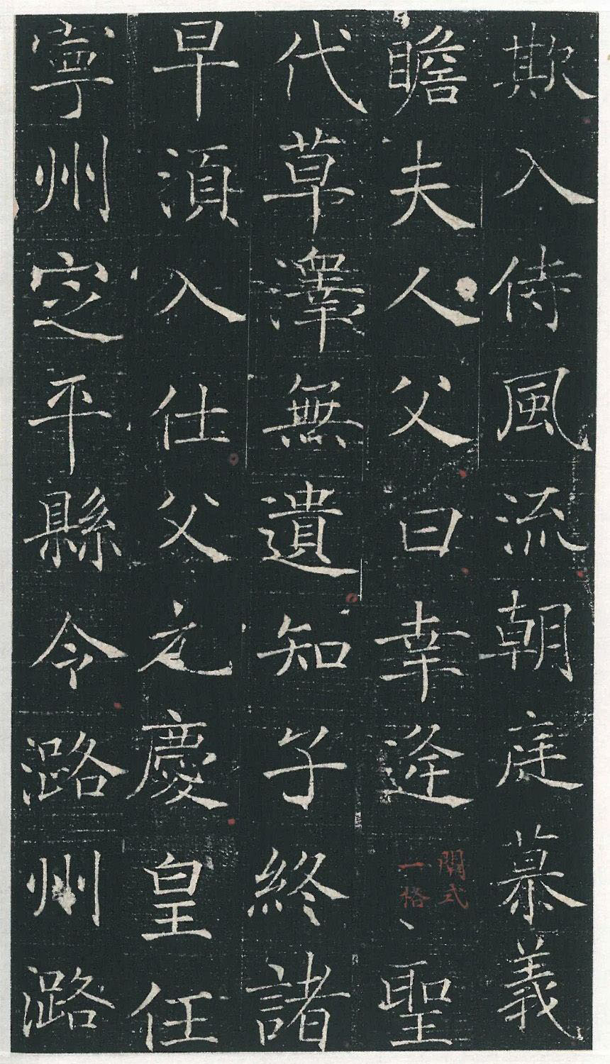 此志書風極似褚遂良,書寫醇正平和,使轉勁健灑脫,結字更是著意模擬褚書《雁塔圣教序》而極為肖似。清人梁山鮮《評書》中有:“褚書提筆‘空’,運筆‘靈’。瘦硬清挺,自是絕品。”以此觀《馬府君夫人墓志銘》可知此銘文的書寫非對褚遂良書法浸淫深厚者不能為。志文的書寫中尤其是結字的體勢和氣息的把握,如以第七列“可教”、第十列“晨夕”、第十六列“乙丑”等字,與褚書《雁塔圣教序》中的原字對比的話,均可以看出在唐開元年間,褚遂良書風影響的深廣。在這件墓志銘的書寫中,書手對于褚書的起、收、轉、折、鉤、挑,甚至是波磔中的一些習氣都力求相似甚至相同,如其中“令”“之”“人”“遺”等字的長捺末尾處的顫筆在通篇中大量出現,就已經不是書寫中的失誤,而是幾乎變成了一種病態(tài)的模擬,因為這種現象在褚書《雁塔圣教序》中雖然也有出現,但并不能說這可以作為一個獨立的特征進行表現。因此說雖然書手也有不成熟的表現,但都掩蓋不了這件墓志銘是所見已出土唐墓志中與褚遂良書風最為接近的作品的事實。