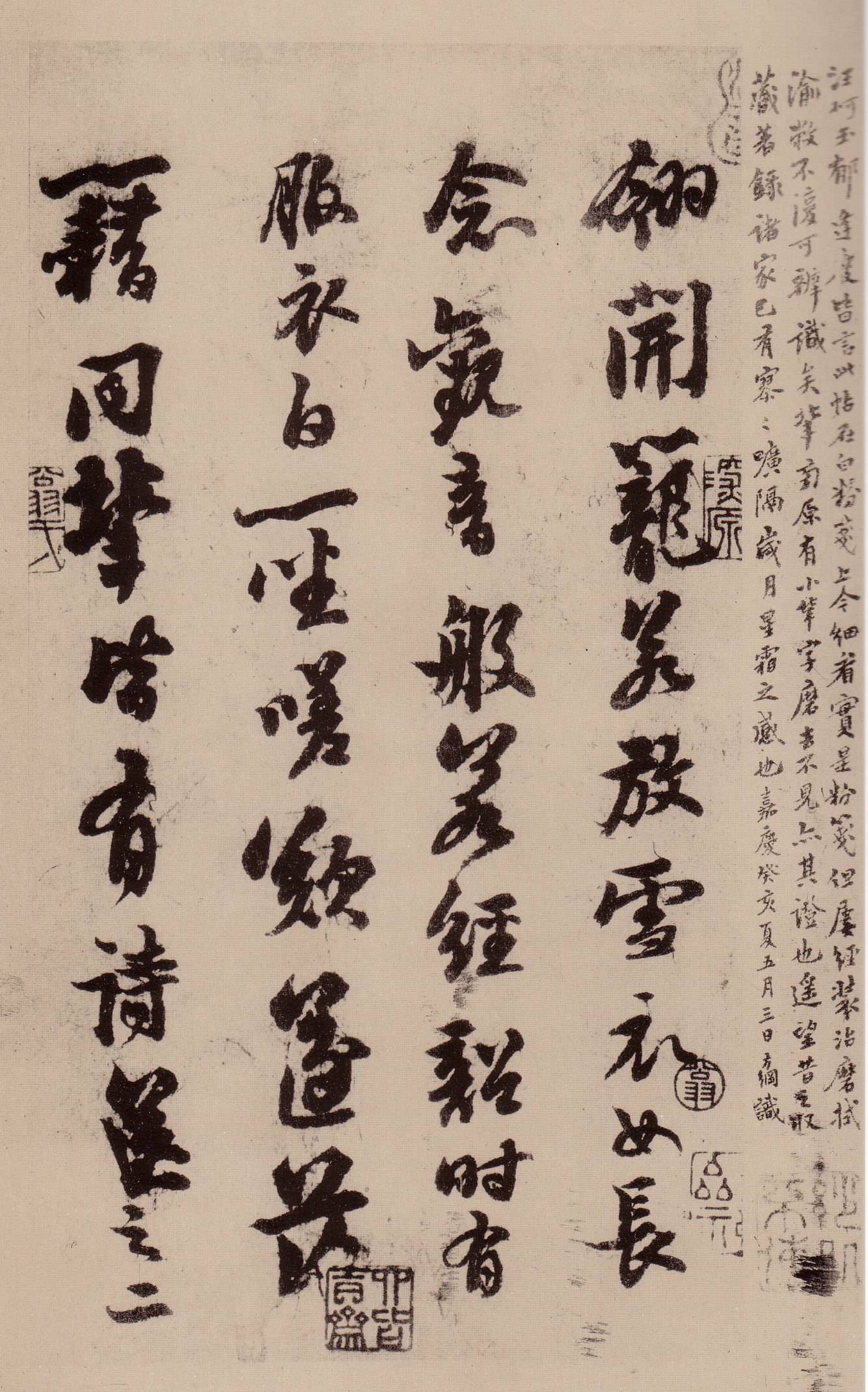 此帖無年款,據(jù)清翁方綱所考,蘇軾有《常潤道中,有懷錢唐,寄述古五首》之作,其次章有“去年柳絮飛時(shí)節(jié),記得金籠放雪衣”句,并自注云:“杭人以放鴿為太守壽。”此正是帖中所言陳太守放營妓周韶事,杭人稱譽(yù)之。因周韶詩中有“開籠若放雪衣女”事,正應(yīng)放鴿為壽。此在熙寧五、六年間事。翁氏又考蘇詩外集有《過濰州驛,見蔡君謨題詩壁上云:“綽約新嬌生眼底,逡巡舊事上眉尖。春來試問愁多少,得似春潮夜夜添。不知為誰而作也?和一首》。此事在蘇軾自密州移徐州之際,即在熙寧九年蘇軾濰州度歲時(shí)。翁氏即猜此帖在熙寧十年書。然詩與帖又有矛盾:帖云“仆在錢塘”見“堂前小閣中壁上”書蔡君謨“綽約新嬌”詩,而詩云:“過濰州驛,見蔡君謨題詩壁上云:‘綽約新嬌……’。”二者必有一偽。再,《蘇文忠公詩編注集成總案》又載蘇軾《題蔡君謨?cè)姴荨吩疲骸按瞬叹儭秹?mèng)中》—詩,真跡在濟(jì)明家,筆力遒勁。”并自署為“元皊五年十月四日”。此是蘇軾知杭州事,距初悴杭州又十五、六年時(shí)間。這又留下一個(gè)可猜想的余地。但帖中“仆在錢塘”云云,書此帖時(shí)必不在錢塘。因之,斷為熙寧十年左右較合理。然翁氏在帖考中又云此帖書頗類《滿庭芳詞——為王長官作》和《上清宮詞》書。前者書于元豐六年,后者書于元皊二年。因此斷定在熙寧十年至元皊二年這十年之間。此又平添一重疑難也。