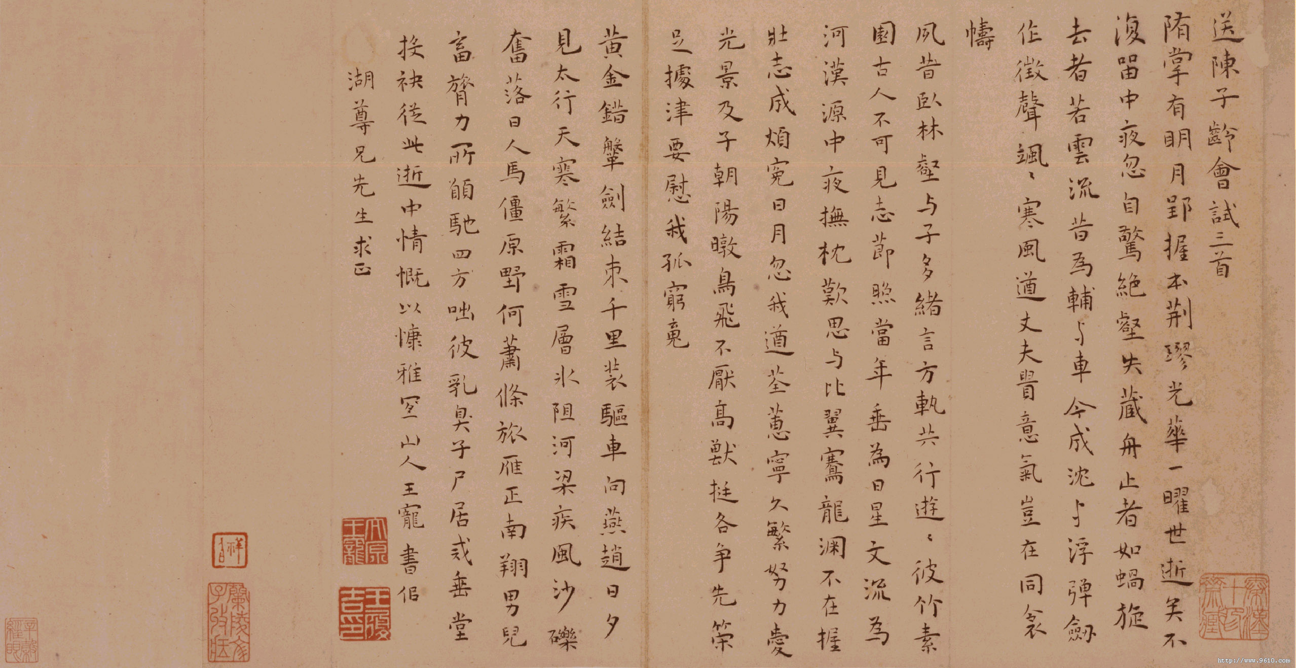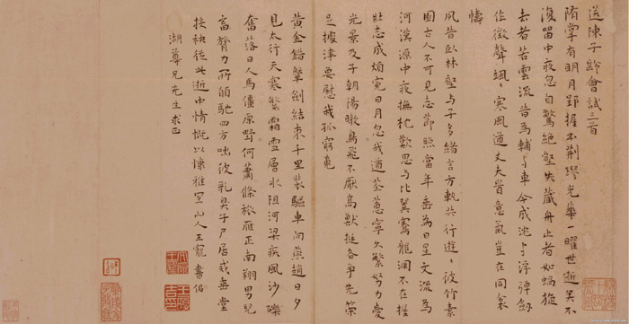 王寵《送陳子齡會試詩》,文中“陳子齡”為王寵門人。鈐“太原王寵”、“王履吉印”印2方。收藏印鈐“秦漢十印齋藏”、“蘭陵文子收藏”、“祥伯”、“辛谷經(jīng)眼”等印。