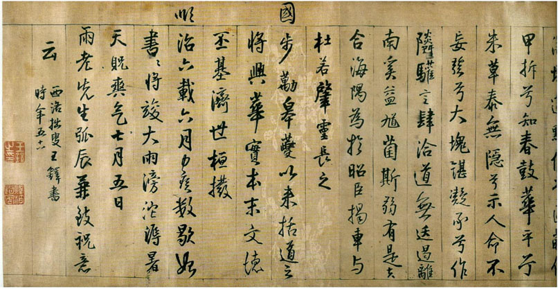 已丑夏五月廿二日。聞?dòng)旯壬w下盎中建蘭于既萎后倏發(fā)一莖三花。予駭焉。萎而花。此中有道。其發(fā)蘭之為其所以發(fā)皇者。果蘭之為耶。蘭。花卉中抱德者也。孤秀幽藏。異乎衒。無人清湛。異乎佝。不斗艷于鼠姑將離。異乎爭。映景乘旺。萼蕤跗聯(lián)。乃于萎荄勃然生靈光奇馞。於戲。蘭亦受命者。氣垕理苞。即司百物者。不能閟。況天況墬況人況蘭。凡后日千葉萬萼。雨先生為國家發(fā)無窮光華。流馨千禩。為王者篤材。不與凡卉伍。吾于斯。率爾席上即寫蘭卷。又紀(jì)其三花之像。鐘萬嘩盛與古咎箄。鳩方絜馥臻茂。開一代之昌運(yùn)。必得一代異人。蘭何能為政哉。噫。公之所以楙昭前路迓所以發(fā)皇者。佗他日吾以此卷券之矣。西洛王鐸跋并畫。吋及燃炬在蔬圃中。