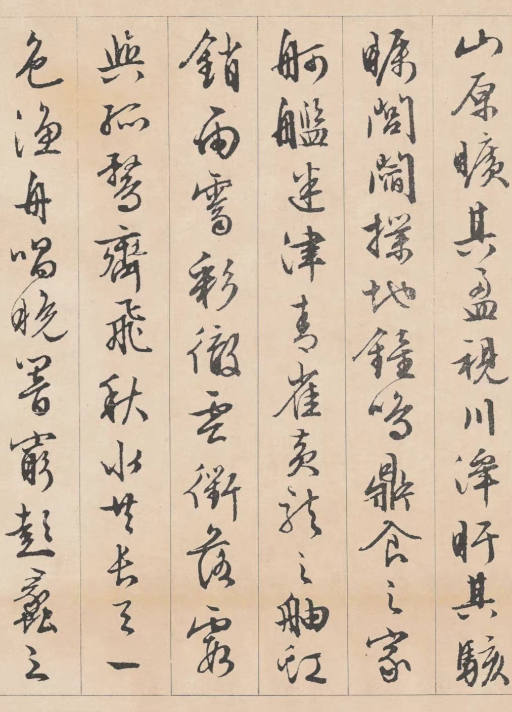 時(shí)維九月,序?qū)偃铩A剩╨iǎo)水盡而寒潭清,煙光凝而暮山紫。儼(yǎn)驂騑(cān fēi)于上路,訪風(fēng)景于崇阿。臨帝子之長(zhǎng)洲,得天人之舊館。層巒聳翠,上出重霄;飛閣流丹,下臨無(wú)地。鶴汀鳧(fú )渚,窮島嶼之縈(yíng)回;桂殿蘭宮,即岡巒之體勢(shì)。披繡闥,俯雕甍(méng )。山原曠其盈視,川澤紆(yū)其駭矚。閭閻撲地,鐘鳴鼎食之家;舸艦彌津,青雀黃龍之舳(軸)(zhú)。云銷雨霽(jì),彩徹區(qū)明。落霞與孤鶩齊飛,秋水共長(zhǎng)天一色。漁舟唱晚,響窮彭蠡(lǐ)之濱;雁陣驚寒,聲斷衡陽(yáng)之浦。