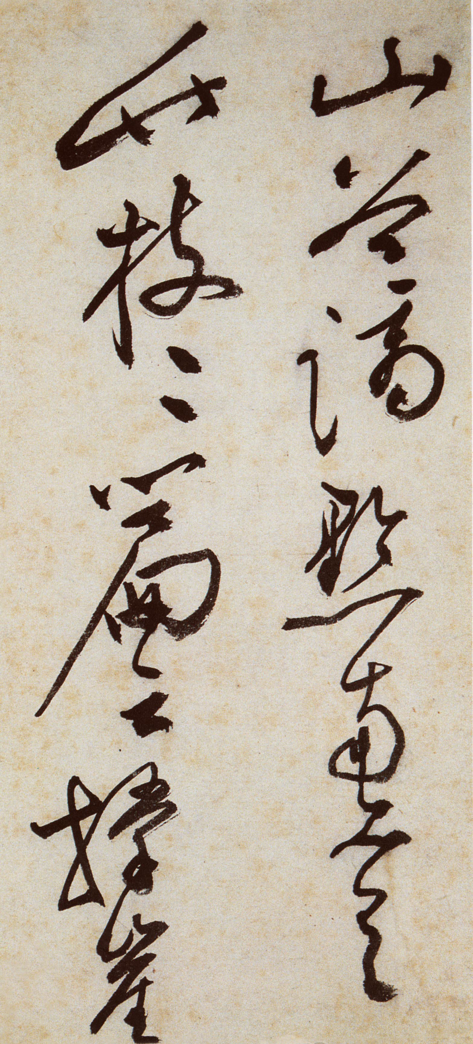 不僅如此,由于文徵明為人一向以品性端方、循規(guī)蹈矩著稱,他在演繹狂草這種十分講求書者性情的書體時(shí),畢竟還是有些力不從心。祝允明個(gè)性放浪形骸,不樂拘檢,因此所書狂草在筆法精熟的基礎(chǔ)上有強(qiáng)烈的自我風(fēng)格,顯得風(fēng)骨爛漫、天真縱逸。文徵明則不然。他的兒子文嘉在《先君行略》中曾論及其詩,云:“詩兼法唐、宋,而以溫厚和平為主。或有以格律氣格為論者,公不為動(dòng)。為文醇雅典則,其謹(jǐn)嚴(yán)處一字不茍。”這種溫厚和平、醇雅典則的天性表現(xiàn)到他的書法作品中,即使是狂草這樣的書體形式,也都寫得法度森嚴(yán)、中規(guī)中矩、一絲不茍。在本草書詩卷中,我們可以清楚地看到因其書寫過于認(rèn)真著意而導(dǎo)致的兩個(gè)毛病。一是用筆空乏,常有敗筆。清人張照《天瓶齋題跋》云:“書著意則滯,放意則滑。其神理超妙渾然天成者,落筆之際,誠所謂不及內(nèi)外及中間也。待詔書不為董香光所重者,正以著處滯而放處滑。”卷中的“入”、“也”、“之”等字,出于章法的需要刻意拉長筆畫,但并非意興所至,所以線條滯澀。“也”的最后一筆,筆畫僵硬,缺乏神采。“之”字的彎曲弧線亦十分生硬,與上下兩字的收筆和起筆都有脫節(jié),意氣不能連貫。“一”字學(xué)山谷的橫畫,欲寫出一波三折之妙趣,但似乎略遜力度。“啼”字的豎畫也是明顯的敗筆,為表現(xiàn)虬曲不平而下筆飛動(dòng),卻顯得有些浮滑。他學(xué)山谷多用點(diǎn),但在排列這些點(diǎn)時(shí)卻少了一些靈性。如“三”字,上下三個(gè)點(diǎn)依次排下,狀如算子。二是情感不足,節(jié)奏平淡。通常狂草作品因注重個(gè)性情感的抒發(fā),隨著書者情緒的波動(dòng),會(huì)有明顯的節(jié)奏感。但在文徵明的這件作品中,既無墨色枯淡的節(jié)奏性的變化,亦無一張一弛的勢(shì)態(tài)拉伸,全篇前后以同一個(gè)節(jié)奏同一種面貌示人,顯得平淡無奇。書者既無性情的抒寫,觀者也自然難以有感情的共鳴。因此,文徵明的狂草雖然用筆、結(jié)字、章法都控制得相當(dāng)穩(wěn)定和熟練,但由于其個(gè)性的關(guān)系,畢竟缺少風(fēng)格,其藝術(shù)成就是遠(yuǎn)遠(yuǎn)不及其小楷其行書的。文徵明在五十一歲寫過《八月六日書事秋懷詩草書卷》后,再也不寫類似的狂草大字作品,實(shí)屬有自知之明。盡管如此,因徵明大草并不多見,本草書詩卷又體現(xiàn)了其大草作品的典型風(fēng)格,故依然彌足珍貴。