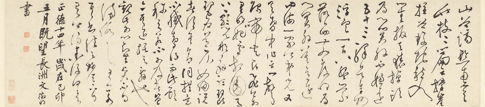 文徵明《草書跋黃庭堅(jiān)劉夢(mèng)得竹枝詞卷 》紙本 29.5×133.4cm 1519年 無錫博物院藏