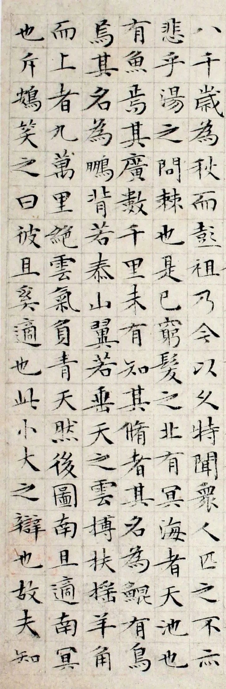 現(xiàn)藏湖南省博物館的文徵明楷書《莊子南華經(jīng)》冊,是作者用小楷工工整整書寫出來的。該冊書錄的為”內(nèi)篇”部分,即《逍遙游》《齊物論》《養(yǎng)生主》《人世間》《德充符》《大宗師》《應(yīng)帝王》計7篇。從第四篇《人世間》開始有缺文。之后自題跋云:"余昨歲為世程書,原道自念髦衰多病,不知明歲尚能小楷否?或笑八十老翁,旦暮人耳,何可歲年期邪!不意今復書此,然比來風濕交攻,臂指拘窘,不復向時便利矣。乙卯(嘉靖三十四年,即1555年)十月八日徵明識。”鈐有朱文“徵”、“明”兩方單字印。
