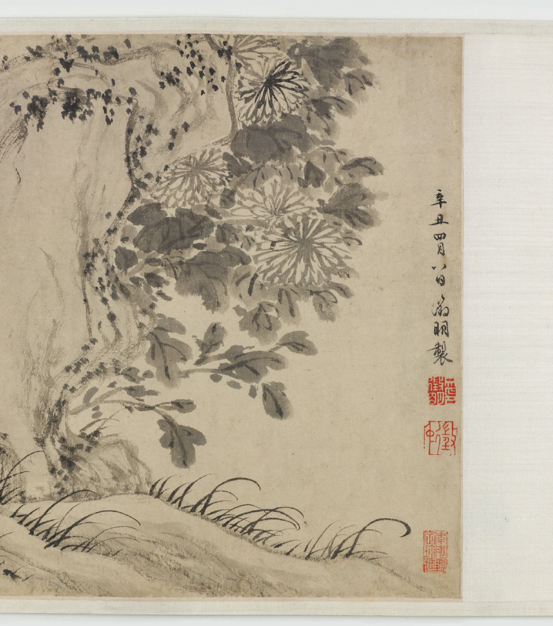 此卷繪菊花湖石,蒼松翠竹。用筆老辣,結(jié)意滿幅,是晚年文徵明的經(jīng)意之作,卷后行草書(shū)錄陶淵明歸去來(lái)辭。可見(jiàn)畫(huà)卷之菊代指淵明采菊東籬下之詩(shī)意。書(shū)法學(xué)黃魯直而化為己意,縱橫無(wú)拘,誠(chéng)晚歲佳作。