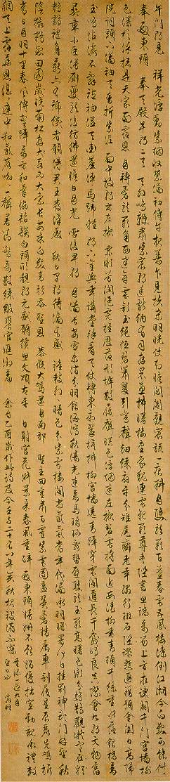 據(jù)題記年月,是文徵明八十九歲時所書,距他逝世只有四個月。雖然他自己以為“筆尤不精,殊不成字”其實(shí)比之現(xiàn)在所見其他各種印本的《赤壁賦》,(一本,嘉靖二十一年壬寅七月十日作,點(diǎn)石齋印;一本,嘉靖二十九年庚戌七月作,有正書局印;一本,嘉靖三十七年戊午二月既望作,原故宮印本,藝苑真賞社復(fù)印;一本,嘉靖三十年辛亥四月十六作,日本博文堂印本)都為精到。“瀟灑流落,翰逸神飛”可謂已至“人書俱老”的境地。
