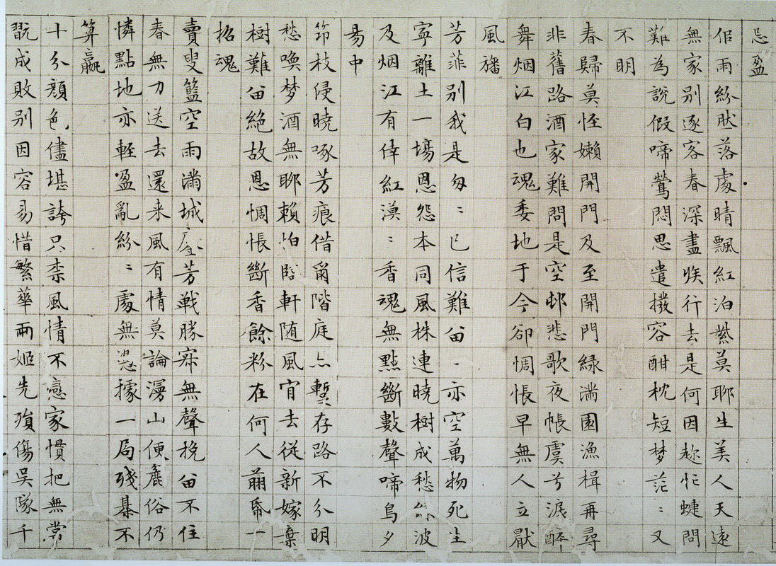 《落花詩冊》生成于公元十五世紀(jì)末,起因是明四家之一的沈周,因老年喪子賦得《落花詩》十首以寄托哀思,吳中士人皆有唱和。一時吟詠落花,數(shù)量之多,非他人可比,令吳門詩壇熱鬧非常,引入矚目。沈周、唐寅等人皆有落花詩冊書法傳世,此為文徵明小楷抄錄的《落花詩冊》。此冊筆力勁健挺拔,瘦勁精勻,流露出“險勁瘦硬、崛起削成”的歐陽詢書意,堪稱精品。
