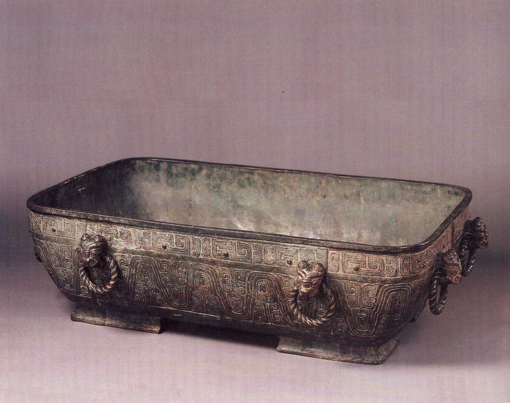 虢季子白盤鑄造于公元前816年,是西周晚期一件具有記功、記事性質的祭祀禮器,長137厘米,寬86厘米,高約39厘米,總重量達215公斤,是迄今為止所見最大的商周青銅盤。設計者將這么大的器型巧妙地設計為圓角的長方形,四足為曲尺矩形,隱縮在盤底,呈現(xiàn)出口大底小的感覺,很像一個大浴缸。器物的四壁各有兩只銜環(huán)獸首耳,盤壁周身刻有波帶紋飾。