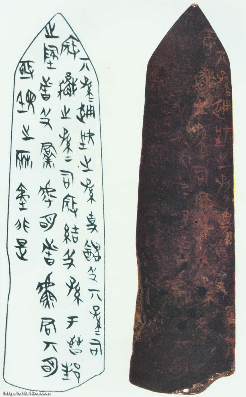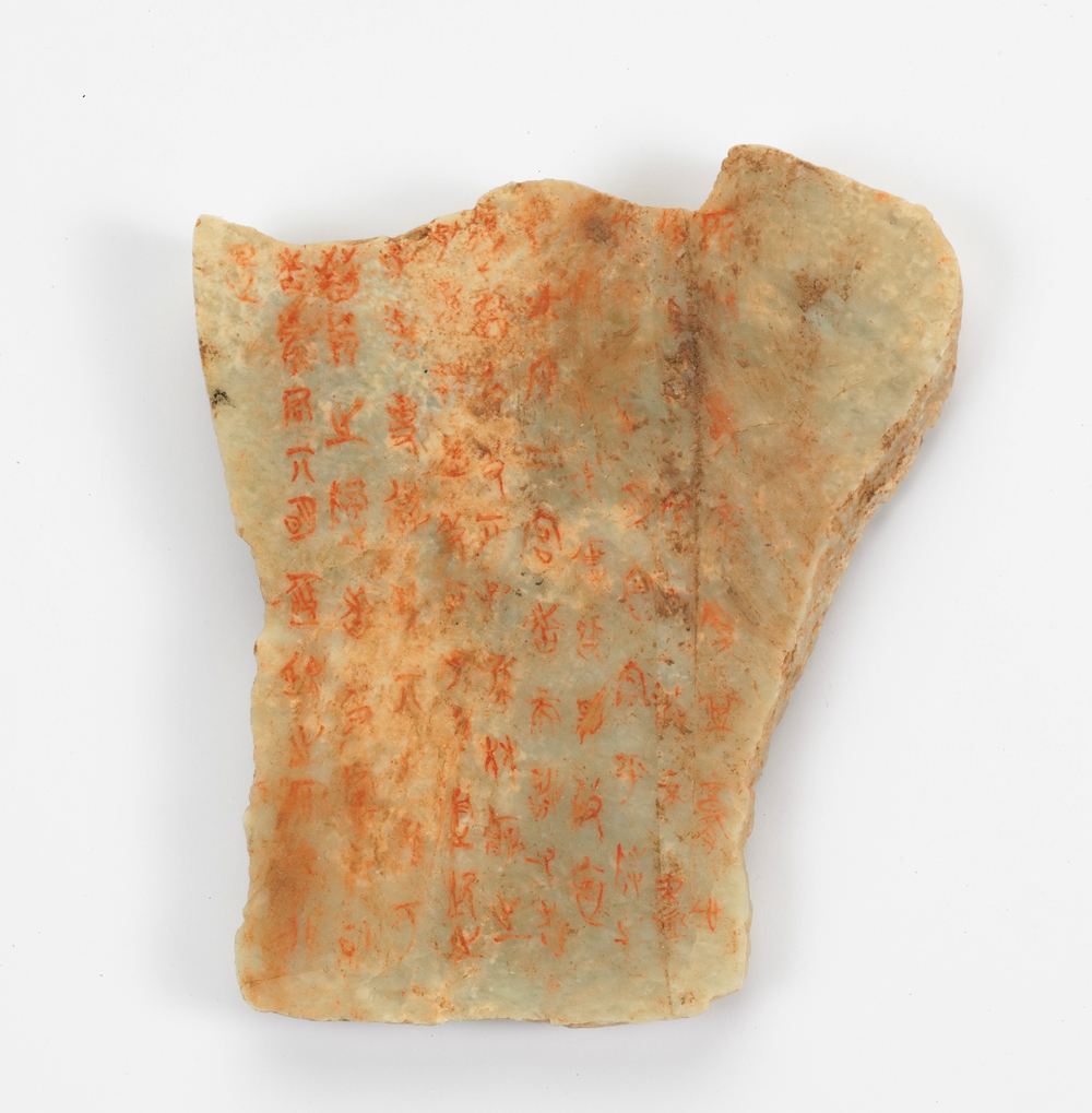 1965-1966年侯馬市晉國遺址出土。在40多個祭祀坑內(nèi)出土玉、石質(zhì)盟書5000余件片,絕大多數(shù)為圭形,最長者32厘米,另有圓形及不規(guī)則形。辭文多以朱筆書寫,少數(shù)為墨筆。文字可辨識者有656件,多則200余字,少則10余字。內(nèi)容可分為主盟人誓辭、宗盟類、委質(zhì)類、納室類和詛咒類等五大類。對于主盟人和盟誓時間存在不同說法,多數(shù)學(xué)者認(rèn)為,侯馬盟書是春秋晚期至戰(zhàn)國早期,以趙氏家族為首舉行盟誓活動的約信文書,忠實(shí)地記錄了晉國晚期強(qiáng)族間相互斗爭的史實(shí),具有政治檔案的性質(zhì)。它的發(fā)現(xiàn)對于研究晉國歷史、古代盟誓制度及古文字等均有重大意義。