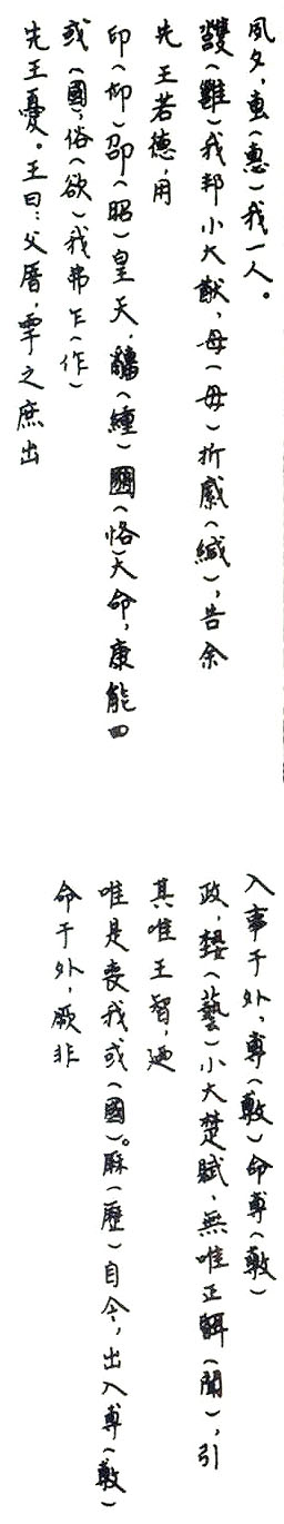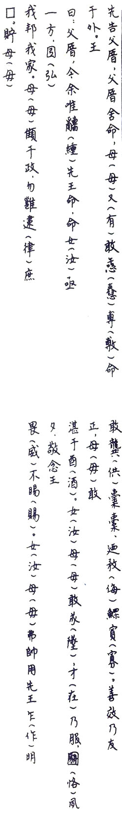 王若曰:“父歆,丕顯文武,皇天引厭劂德,配我有周,膺受大命,率懷不廷方亡不覲于文武耿光。唯天將集厥命,亦唯先正略又劂辟,屬謹(jǐn)大命,肆皇天亡,臨保我有周,丕鞏先王配命,畏天疾威,司余小子弗,邦將曷吉?跡跡四方,大從丕靜。嗚呼!懼作小子溷湛于艱,永鞏先王”。