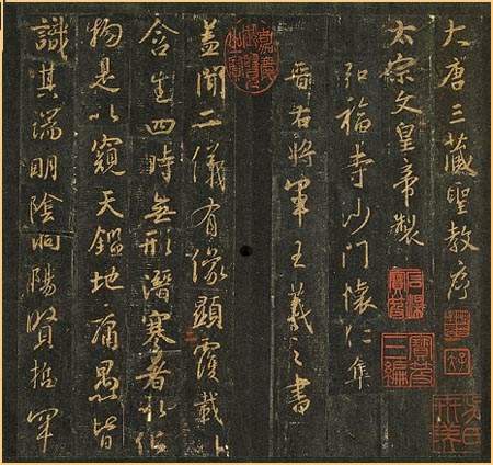 怪事自有根由,這座《大唐三藏圣教序碑》,是玄奘和尚從印度帶回的佛經(jīng),由他精心譯成后,請(qǐng)?zhí)铺谧餍蛭模偌由咸永钪巫魇鲇浖靶实闹x表,通稱《三藏圣教序碑》。此碑立于唐高宗咸亨三年(公元672年),當(dāng)時(shí)朝廷要把它用晉代大書法家王羲之的字體來刻碑。長(zhǎng)安洪福寺高僧懷仁知道此事后,感到是佛教界的光榮,因此,下決心承擔(dān)此任。經(jīng)過懷仁和尚到處尋覓,終于按序文把王羲之的字一個(gè)一個(gè)地搜集起來,成了這塊王羲之字體的《圣教序碑》。