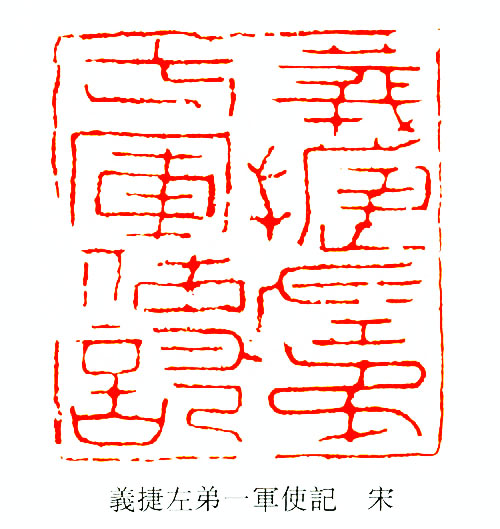 唐宋官印中還有末尾不用“印”,而用“記”或“朱記”的,后人謂之“朱記”。當(dāng)然,這個(gè)“朱記”與泛指唐宋以后印章蘸紅色印泥,鈐于紙帛上,顯得殷紅醒目的那個(gè)“朱記”是兩回事,可以說這兩個(gè)“朱記”的概念是完全不同的。