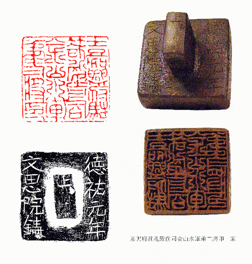 宋代官印的尺寸也較大,這是沿襲隋唐以來官印的特點。因文多九疊篆,也叫上方大篆,九疊的“九"字在中國古代常常是代表多的意思,并非九的確數(shù)。一般小篆書體,往往有疏有密,結體不易布滿。所以就把篆字筆畫來回彎曲盤繞,使得四面充實,布白對稱飽滿,產生均勻整齊,具有裝飾性的美感。另外,這種繁復重疊的印文又使人難以辨認,有防奸辨?zhèn)蔚淖饔?加上巨大的形制,配以比印文寬出三至四倍的粗邊欄,顯示出官府衙門的莊重整肅、森嚴而不容輕視的氣勢。另外“九"為數(shù)之終極,也有“乾元用九"的含義,以此暗示皇權的至高無上和“久遠”,這種帶有封建文化背景的印章形式,迎合了封建統(tǒng)治者的心態(tài)。所以,從宋元到明清時期的官印,一直沿用九疊篆印文。