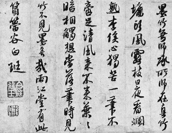 墨竹無師承。所師在真竹。墻頭風(fēng)露枝。日夜看爛熟。李侯心獨(dú)苦。一筆不啻足。清風(fēng)來不來。葉葉暗相觸。想當(dāng)落筆時(shí)。見竹不見墨。寄哉雨江堂。有此筼簹谷。白珽。