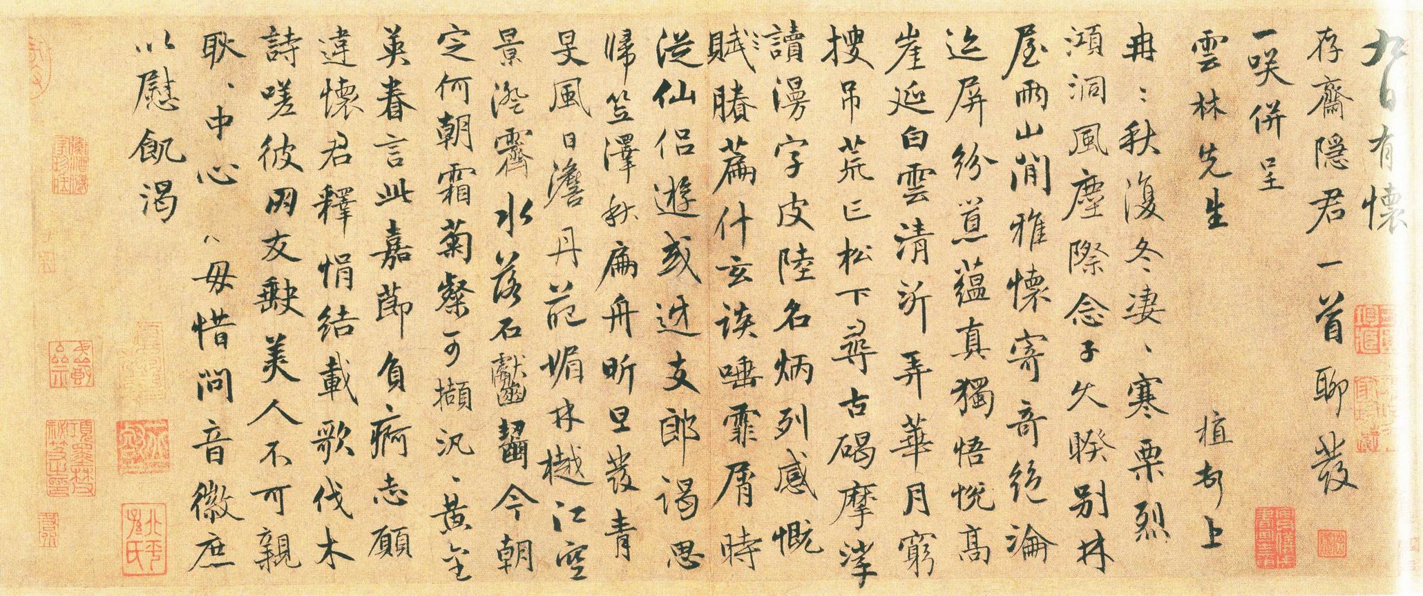 這是陳植寫給"存齋隱君"的一首五言古詩,以詩代柬。"存齋"就是沈右,沈右自署"存存齋",陳基《夷白齋稿》有"存存齋記"一篇,云:"沈君仲說(沈右字仲說),隱居于吳會,耕學于笠澤,廬于陳公之原,而皆名其室曰存存齋"。此詩中亦有"思歸笠澤秋"的句子,與上說正合。另外 在存世的沈右書跡中,也常提及陳植,其中"詩柬帖"即"與叔方詩札并柬"帖,就是給陳植的,可知二人交往頗密。"云林",即倪瓚,時亦在吳中。