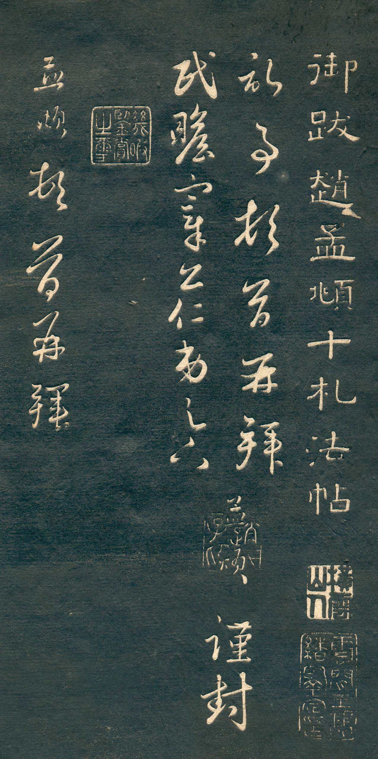 (札五) 孟頫再拜仁卿學士老弟坐右。頃聞旆從到桐川。相望甚邇。何不一過我。殊恨恨也,爾來想動履勝常。聞吾弟有翡翠石。蒙愛若此.能舉以見惠否。
