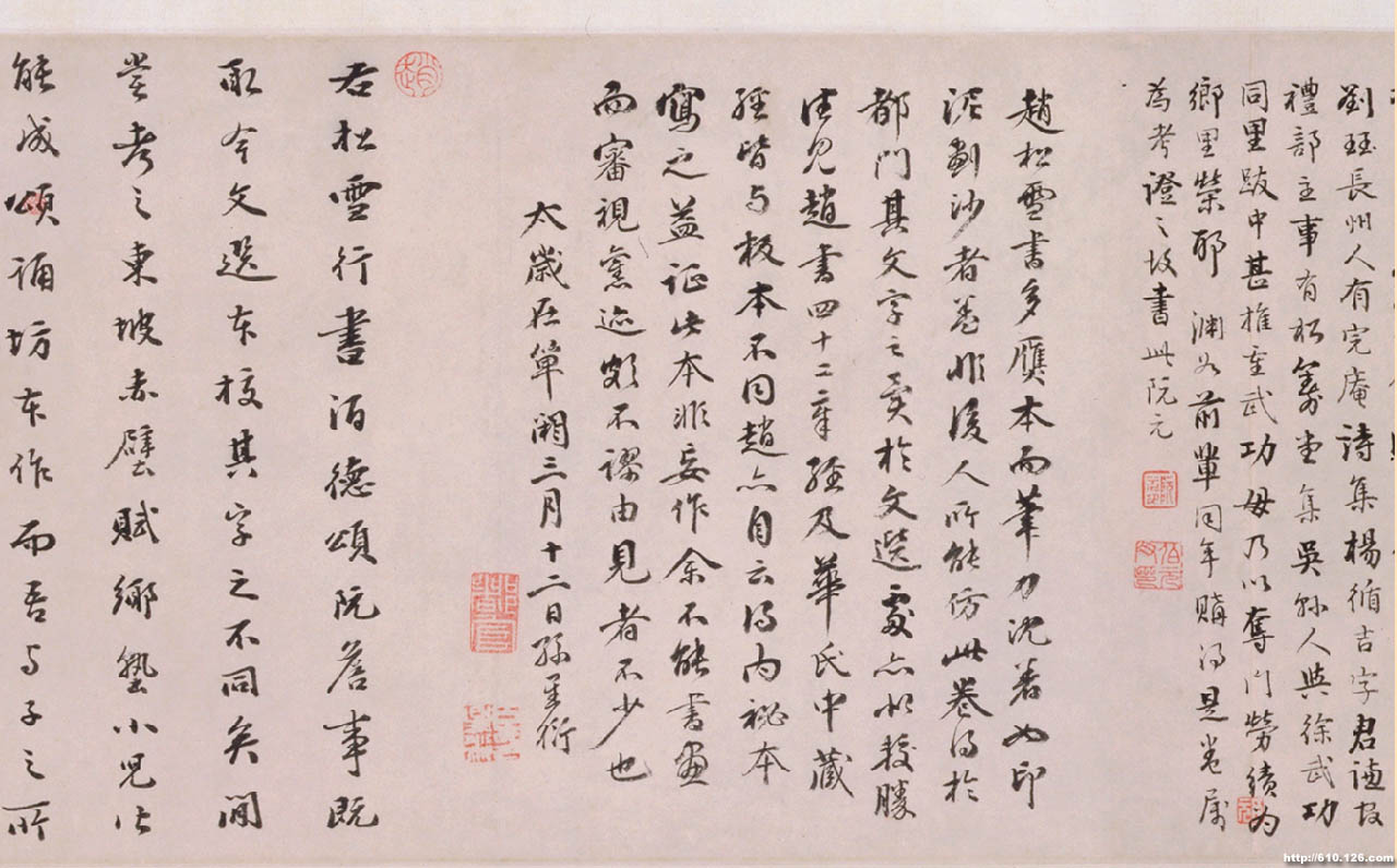 本幅自識:“延祐三年丙辰歲十一月廿一日,爲(wèi)瞿澤民書。子昂。”鈐“趙子昂氏”印。帖后題跋有孫星衍(5段)、徐有貞、陳鑒、劉玨、楊循吉、文彭、王穉登、翁方綱(4段)、阮元等26家。鑒藏印有戴植、吳云、顧文彬等15方。