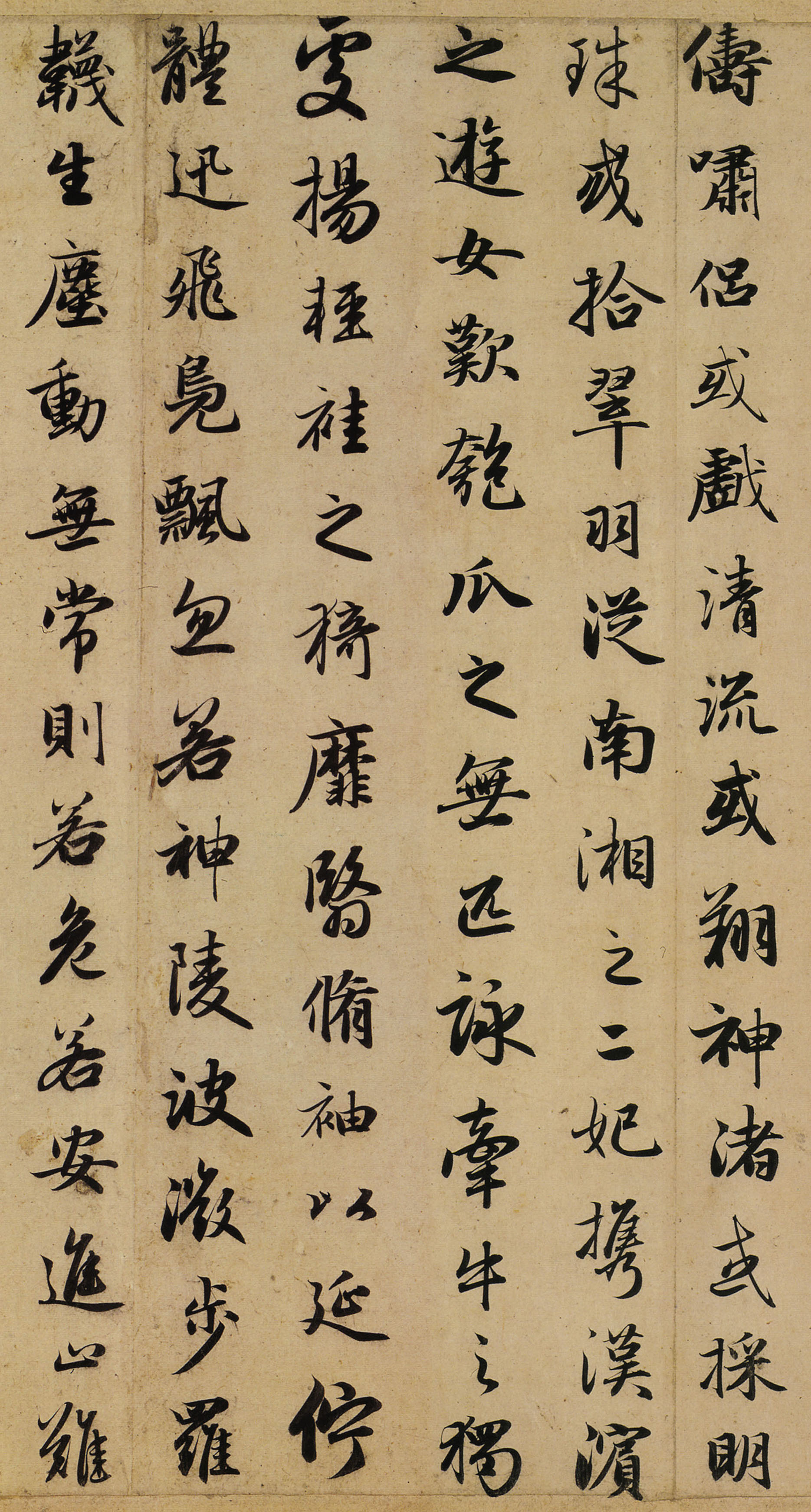 《洛神賦》紙本 縱29.2公分,橫193公分, 現(xiàn)藏天津市博物館,另有北京故宮博物院藏本,又有說美國普林斯頓大學(xué)博物館趙孟頫《洛神賦》是真跡。《洛神賦》大德四年(公元1300年)書,時(shí)趙氏四十七歲。結(jié)構(gòu)謹(jǐn)嚴(yán),用筆圓轉(zhuǎn)流美,是趙孟頫書法力作。卷尾有元代何心山、倪瓚題記,清代英和觀款。曾經(jīng)明代項(xiàng)子京,清代陳準(zhǔn)、陳崇本、孫爾準(zhǔn)、崇恩、近代張翼等人鑒藏,張翼之子張叔誠1981年捐贈(zèng)。