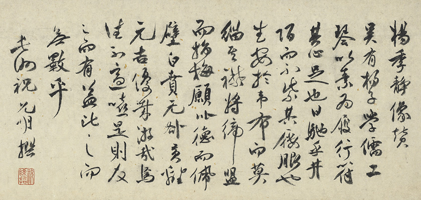 《楊季靜小像》,文伯仁作於1526年。楊季靜(1504以前-1530),蘇州著名的琴師,與祝允明、文徵明、唐寅等人友善,唐寅亦曾作《南游圖卷》與《琴士圖卷》圖其貌。祝允明約六十四歲作此贊,原應(yīng)題《琴士圖卷》,后為人移至此。此作用筆放縱自然,線條遒勁老辣。運(yùn)筆雖狂而能收,無論提按頓挫,或轉(zhuǎn)折迴旋,都不踰矩。結(jié)體雖多橫向伸展,亦自有法度。此作代表祝允明晚年不受拘束的行書風(fēng)格,寫來得心應(yīng)手,為其本色行書。
