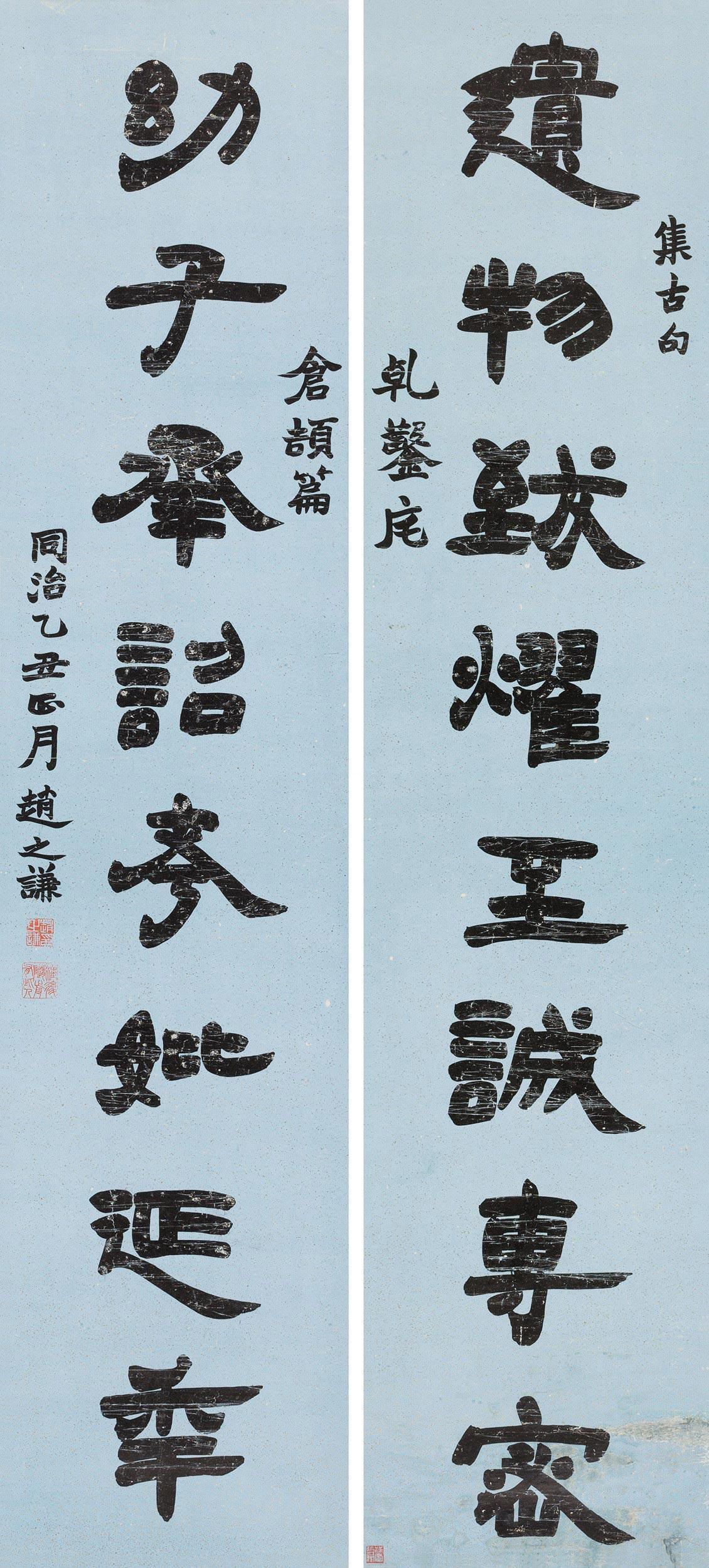 趙之謙書(shū)寫(xiě)的這幅對(duì)聯(lián),摘錄于中國(guó)非常古老的兩篇名著,《乾鑿度》,中國(guó)西漢末緯書(shū)《易緯》中的一篇。又稱《易緯乾鑿度》,簡(jiǎn)稱《乾鑿度》。《乾鑿度》是緯書(shū)中保存完好、哲學(xué)思想較為豐富的作品。“乾”為天,“度”是路,《乾鑿度》有開(kāi)辟通向天上道路的意思。“遺物致耀至誠(chéng)專密”出自《乾鑿度》卷上“移物致耀,至誠(chéng)專密”,漢鄭康成注釋:“移動(dòng)也。天確爾至誠(chéng),故物得以自動(dòng),寂然皆專密,故物得以自專也”。《倉(cāng)頡篇》,秦李斯著。原是教育學(xué)童識(shí)字的字書(shū),秦始皇帝統(tǒng)一文字時(shí)又成為小篆書(shū)體的樣板,亦有古隸書(shū)版流傳。《倉(cāng)頡篇》自宋朝始曾一度軼失,至清末民初考古才得重現(xiàn)。“幼子承詔考妣延年”出自《倉(cāng)頡篇》,“幼子承昭指秦二世胡亥繼位(公元前210年,秦始皇死后,李斯為保全自己的既得利益,附和趙高偽造遺詔,立少子胡亥為帝);“考妣延年”,考字古文原義指父親,妣字古文原義指母親,“考妣延年”指孝順父母使其長(zhǎng)壽,兩句均出自倉(cāng)頡篇。(倉(cāng)頡是中國(guó)古代傳說(shuō)人物,傳說(shuō)為黃帝的史官,漢字的發(fā)明者。被后人尊為中華文字始祖)。由于趙之謙博學(xué)多才,尤喜古文奇字,其在書(shū)寫(xiě)中,多有使用奇古偏生之字習(xí)好,本聯(lián)共書(shū)寫(xiě)了三十四個(gè)字,其中用了數(shù)個(gè)生澀怪僻難懂字,以致令人揣摩費(fèi)解。正因如此,也使趙之謙一生三次入都,四次參加禮部試,皆名落孫山。就在趙之謙書(shū)寫(xiě)完成這幅《集古句. 乾鑿度. 倉(cāng)頡篇》的得意之作僅兩個(gè)月,也就是同治四年三月,趙之謙在京參加了乙丑(1865)年的會(huì)試再用“乾鑿度”,遭主試官以 “經(jīng)藝貪用緯書(shū)子史,致主司有不識(shí)之字三十余”(摘自《趙之謙年譜》142頁(yè)) 而不第。趙之謙在同年五月致胡培系(子繼)長(zhǎng)函云:“弟今年會(huì)試,以后場(chǎng)用乾鑿度被斥”。以后又參加了1868年禮部試,結(jié)果亦相同;同治十年(1871),已經(jīng)被薦于入取之列的趙之謙朱卷,因有的考官認(rèn)為后場(chǎng)考卷用的奇字、古字較多,主張?jiān)僮餮芯恐蟛艣Q定是否錄取。位高權(quán)重的譚廷襄一聽(tīng)浙江卷中有奇字,立刻獨(dú)排眾議:“浙江卷用奇字,非趙之謙而誰(shuí)?棄之可也,奚研究為!”。在科舉路途上,趙之謙因鄙視八股文,好引用古文和奇字,受到某些考官的抑制,致功名不偶,抑郁潦倒。由于清代歷來(lái)?yè)?dān)任會(huì)試主考或參與閱卷者中多有清朝宗室,個(gè)別人不明經(jīng)義愚昧無(wú)知,也有部分考官位高權(quán)重,學(xué)問(wèn)卻未必淹通,而為數(shù)眾多的落第舉子們由于多年苦讀未受識(shí)拔而心懷怨望,并歸因于考官治學(xué)不精、不識(shí)人才,所以一旦有文才出眾者因考官之疏誤而落榜,在同情之余,往往會(huì)將他們作為受難的英雄式人物來(lái)加以推揚(yáng),甚至奉為清流。趙之謙便由此聲望大著,受到不少高門權(quán)貴的看重。趙之謙在會(huì)試中‘貪用緯書(shū)子史”的行為,本身是值得推敲的。緯學(xué)起源甚早,是與“經(jīng)學(xué)”相分立的另一個(gè)思想體系,曾在兩漢思想文化領(lǐng)城占有非常重要的地位。傳世緯書(shū)屈指可數(shù),且多為從其他書(shū)籍中擇抄而成,斷簡(jiǎn)零篇,古奧難解。在清代經(jīng)學(xué)大興的背景下經(jīng)學(xué)家對(duì)于緯學(xué)一股抱持比較疏離的態(tài)度,而緯書(shū)往往語(yǔ)辭晦澀隱秘,又由于摻和方士術(shù)數(shù)之技而漸至流于荒誕之弊,多為當(dāng)時(shí)學(xué)者所不取,更不用說(shuō)主持朝廷擇才的考官了。趙之謙對(duì)這些情況是有所了解的,但在考卷中仍然引用緯書(shū)奇字這事實(shí)上是他爭(zhēng)強(qiáng)好勝的個(gè)性與炫技矜奇的心態(tài)的不自覺(jué)流露,當(dāng)然更多的是他對(duì)官場(chǎng)的不學(xué)無(wú)術(shù)、忌才妒能的一種鞭撻。如果聯(lián)系到當(dāng)時(shí)的時(shí)代和社會(huì)政治背景,聯(lián)系到當(dāng)時(shí)朝廷對(duì)于國(guó)中士子風(fēng)習(xí)持有鮮明的褒貶取向,趙之謙科考道路的失敗,應(yīng)是清代政治制度下的必然結(jié)果。此幅對(duì)聯(lián)應(yīng)時(shí)而生,除反映了趙之謙的博學(xué)多才多藝及他的精神生活層面的堅(jiān)守,也成了趙之謙究其一生竭力入仕無(wú)途的真實(shí)原因?qū)懻眨矠楹笕搜芯口w之謙的輝煌人生及書(shū)法藝術(shù)提供了寶貴的史料。