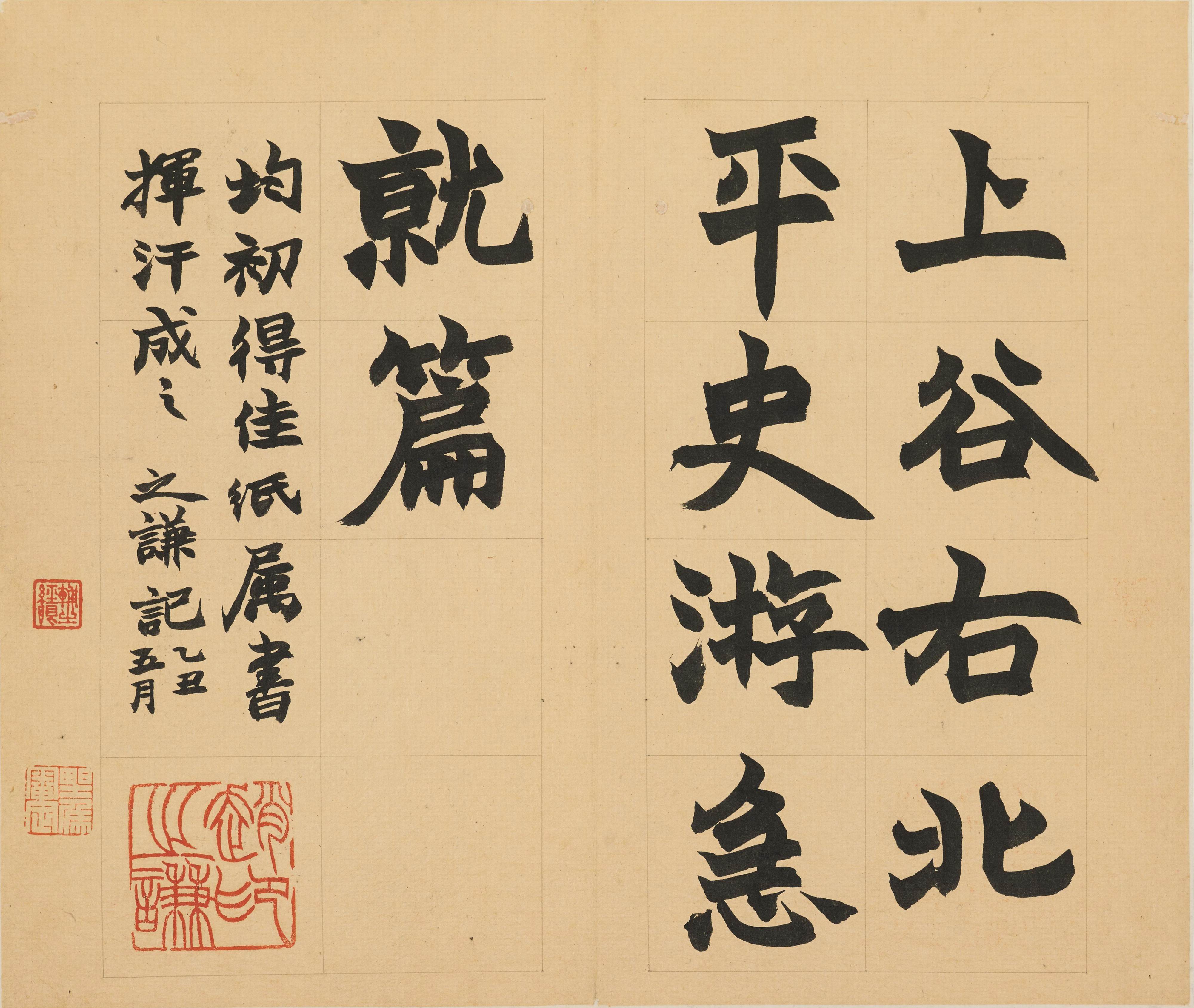 款識:均初得佳紙屬書。揮汗成之。之謙記,乙丑五月。