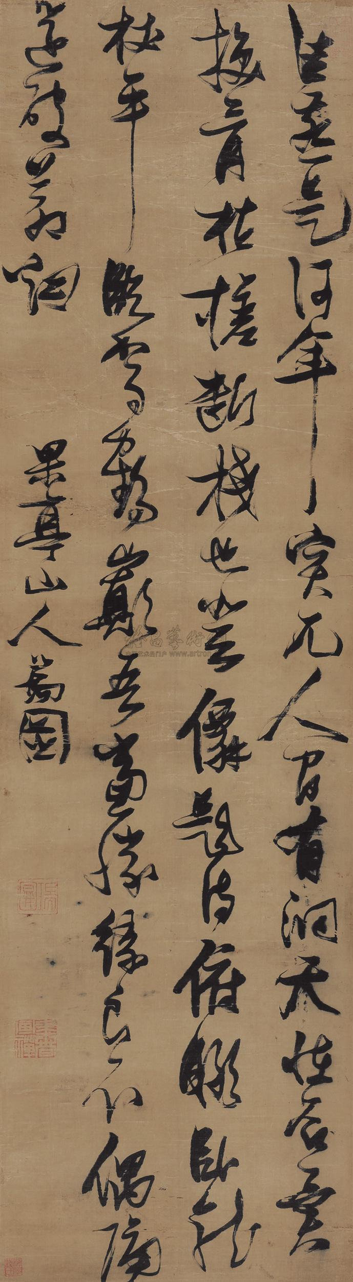 張瑞圖(1570-1641),明代書法家,字長公,又字無畫,號二水,別號果亭山人、芥子、白毫庵主、白毫庵主道人等。福建晉江人。以禮部尚書入閣,為魏忠賢所賞識。書法與邢侗、米萬鍾、董其昌齊名,當時人稱為“邢、張、米、董”。善畫,山水效法黃公望。 張瑞圖(1570-1641),字長公,又字無畫,號二水,別號果亭山人、芥子、白毫庵主、白毫庵主道人等,福建晉江人。官至東閣大學士,著有《白毫庵集》。張瑞圖的書法風格可歸納為運筆疾速、筆性純熟、體勢多變、氣勢逼人,是二王之外另辟蹊徑者。開筆穩(wěn)健,繼而越與越快,筆畫盤旋跳蕩,點畫翻飛; 張瑞圖運筆起、止、轉、折幾乎不作任何回鋒、頓挫的處理,在結字上故意表現(xiàn)出方折緊束的效果。他的行草,峭拔尖歷,激蕩怪戾,若崖斷石崩,天驚地怪,千里一瀉;又若猛獸被執(zhí),筋骨怒張,奮力掙扎。個性極為張揚。此幅書風豪快、勁筆直落,險絕狂肆,氣勢闊大,對比強烈,虛實輕重,給人壯麗峻偉、豪氣干云、酣暢淋漓的視覺震撼!
