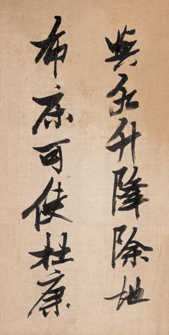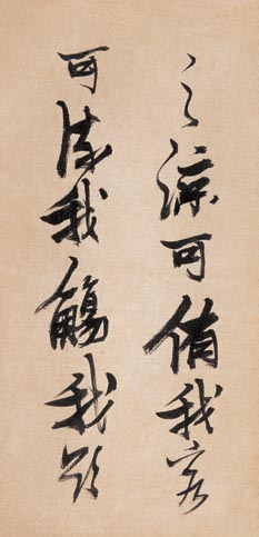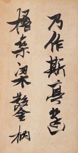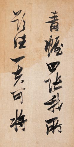 張瑞圖的行書,則是在其楷書的基礎(chǔ)上進行更為隨意和自然的發(fā)揮。其為純行書的作品大都作于崇禎年間,實際上是其晚年書風(fēng)轉(zhuǎn)化,變中期的精彩絢爛為平淡天真這一過程的結(jié)果。行書《郁郁雙松老詩》軸(見第8頁)屬于張瑞圖中期的風(fēng)格,行書《李白詩》軸(見左圖)則是晚年手筆,前者筆勢勁健,氣力充沛;后者則相對平和輕松,氣息恬靜。比較這兩件作品可以看出,張瑞圖晚年的行書,一改從前筆墨飛舞,氣勢逼人的面貌,在形式技巧上也突破了舊有的法則。用筆多以偏鋒,直入平出,不加修飾;字形結(jié)構(gòu)高低欹側(cè),不求勻稱均衡。通篇看去雖似亂頭粗服,漫不經(jīng)心,但如果聯(lián)系到張瑞圖晚年曾“學(xué)禪定以求安心之道”的話,則其含蓄蘊藉又隨心所欲的神態(tài),正好展示出一派充滿禪意的簡遠恬淡之趣。